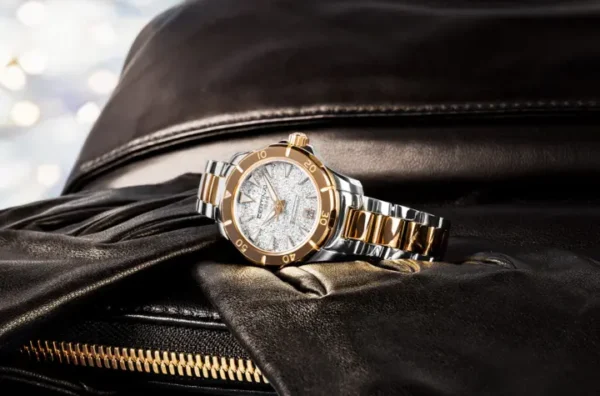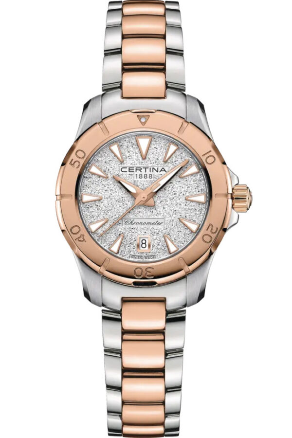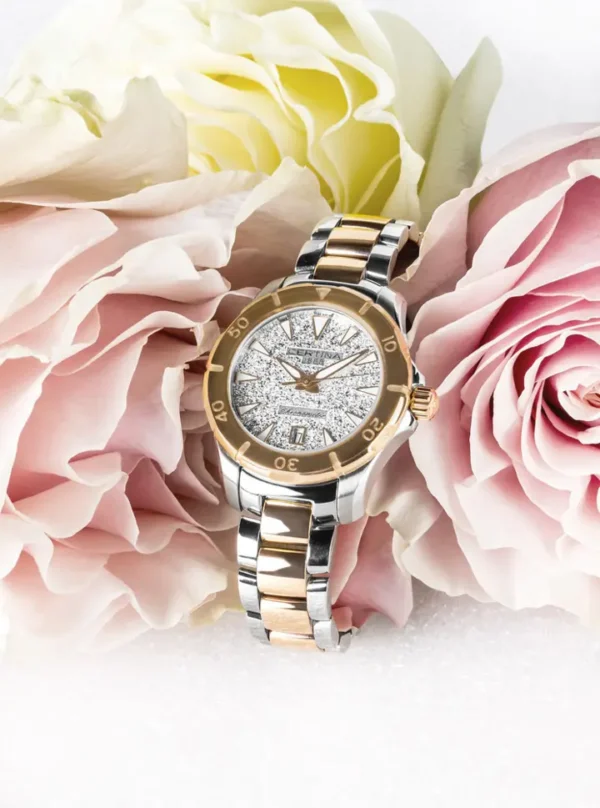 Quarz, 29mm, Datumsanzeige, Edelstahl bicolor rose, Saphirglas, Zifferblatt silber glitzer-effekt